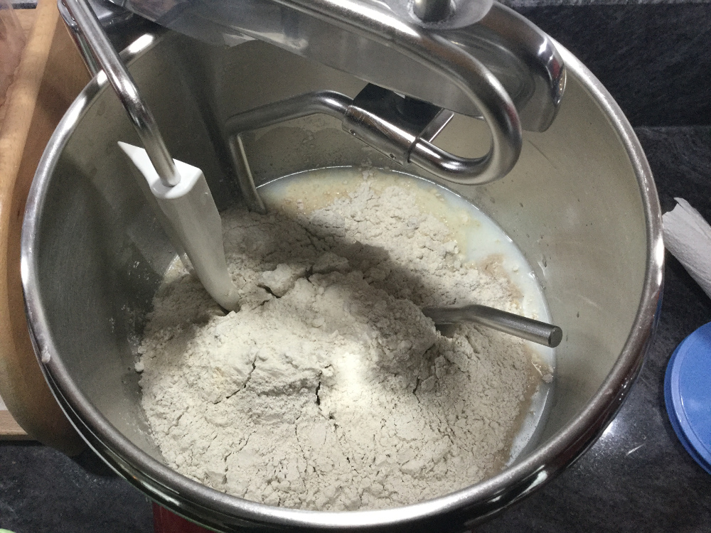Nach ca. 12 Stunden ist der Sauerteig reif und kann mit den anderen Zutaten des Hauptteiges gemischt und geknetet werden. Danach 45 Minuten Teiggare.
