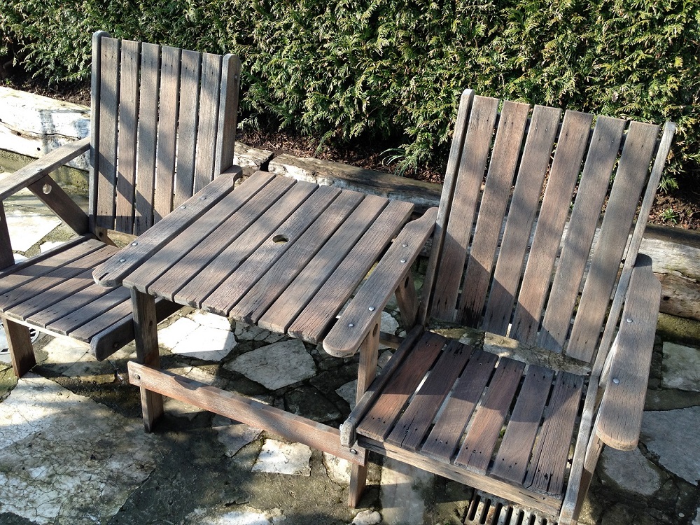Die Garten Sitzbank ist leider ziemlich angegraut....