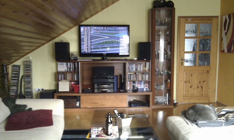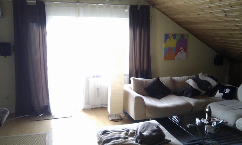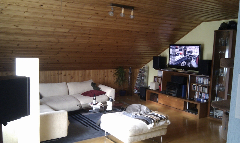 Mein erster Eindruck/Frage: Besteht denn, zumindest theoretisch, die Möglichkeit den Raum umzuräumen? Ich meine, dass wenn Du auf den Fernseher schaust die ganze Geschichte nach links unter die Schräge stellst? Du kämest dann ein wenig weiter in den Raum mit den LS was sicher ein Vorteil wäre. (edit: ob die Möbel auch dahin passen weiss ich natürlich nicht, aber man kann's ja mal probieren)