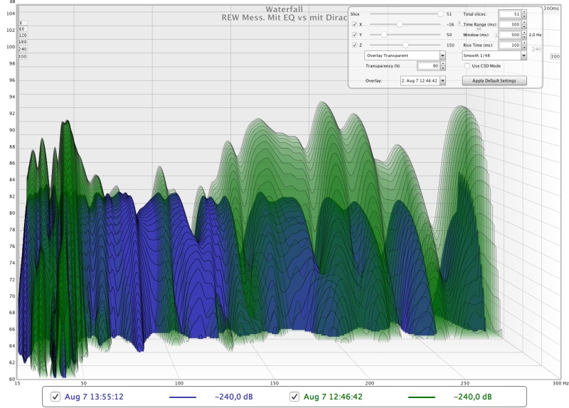 Der Nachhall auch im Bassbereich überschreitet auch ohne Dirac nicht die 350 msec, das ist ja schon ganz gut. Mir Dirac noch etwas besser.