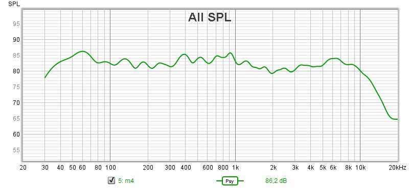 Jetzt habe ich sie 60 cm von jeder Wand entfernt, mMn geometrisch fast perfekt im Stereo-Dreieck aufgestellt, Sitzplatz wieder in Zimmermitte wie vorher, und schon ohne Eingriff klingt es ganz anders und der Frequenzgang ist ganz anders als vorher. Es klingt in Normalstellung ohne Eingriffe ganz schwach. Der Hochton ab 10kHz fällt stark ab.
