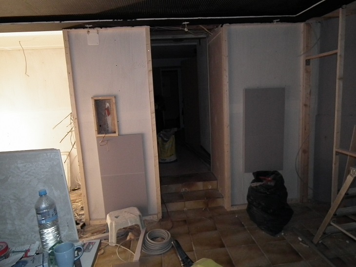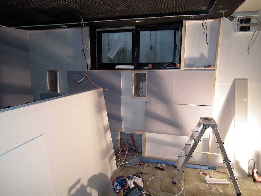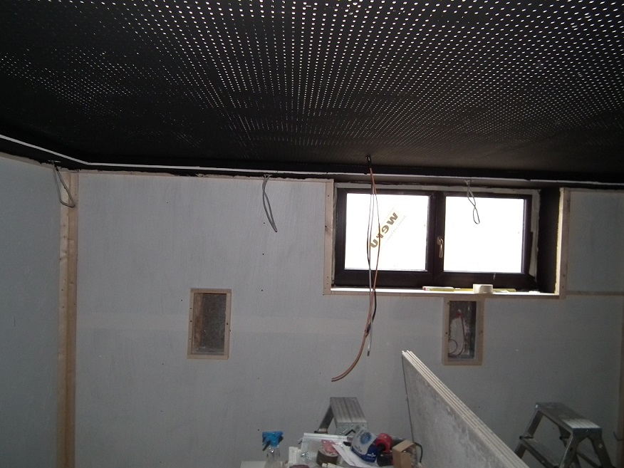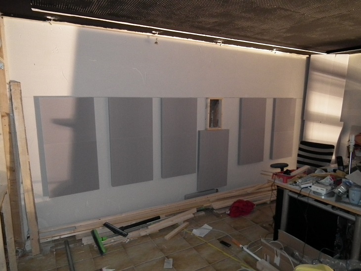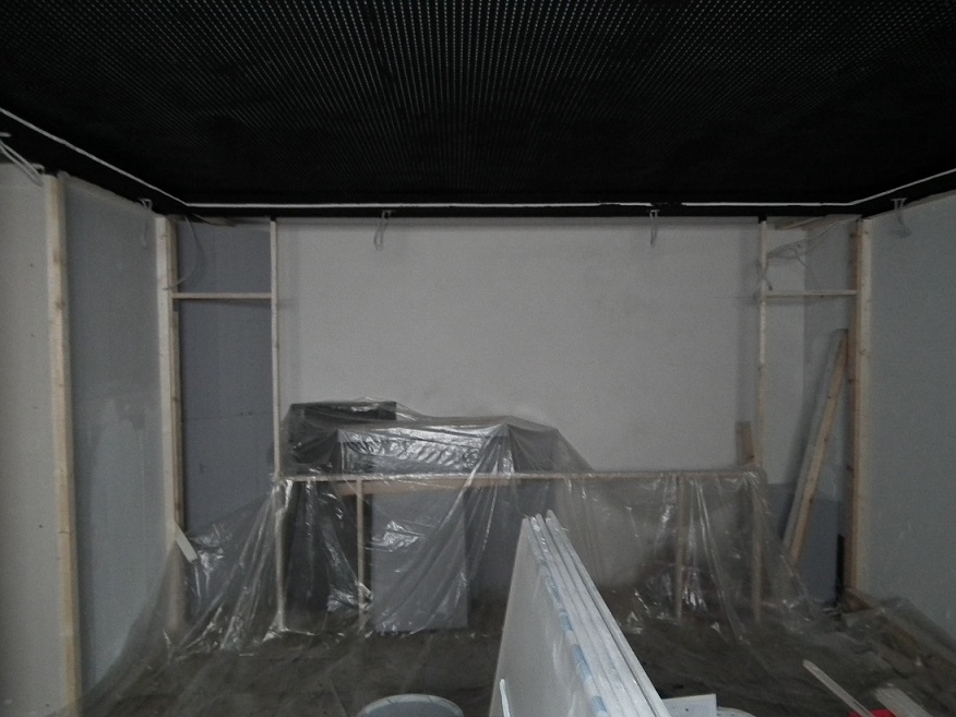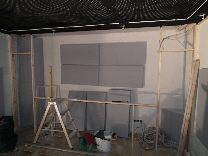 Gestern wurde die Unterkonstrucktion für Absrober und um den Molton zu bespannen aufgebaut. Die Decke ist jetzt schwarz und es fehlen nur die abschlussleisten auf dem Sockel.
