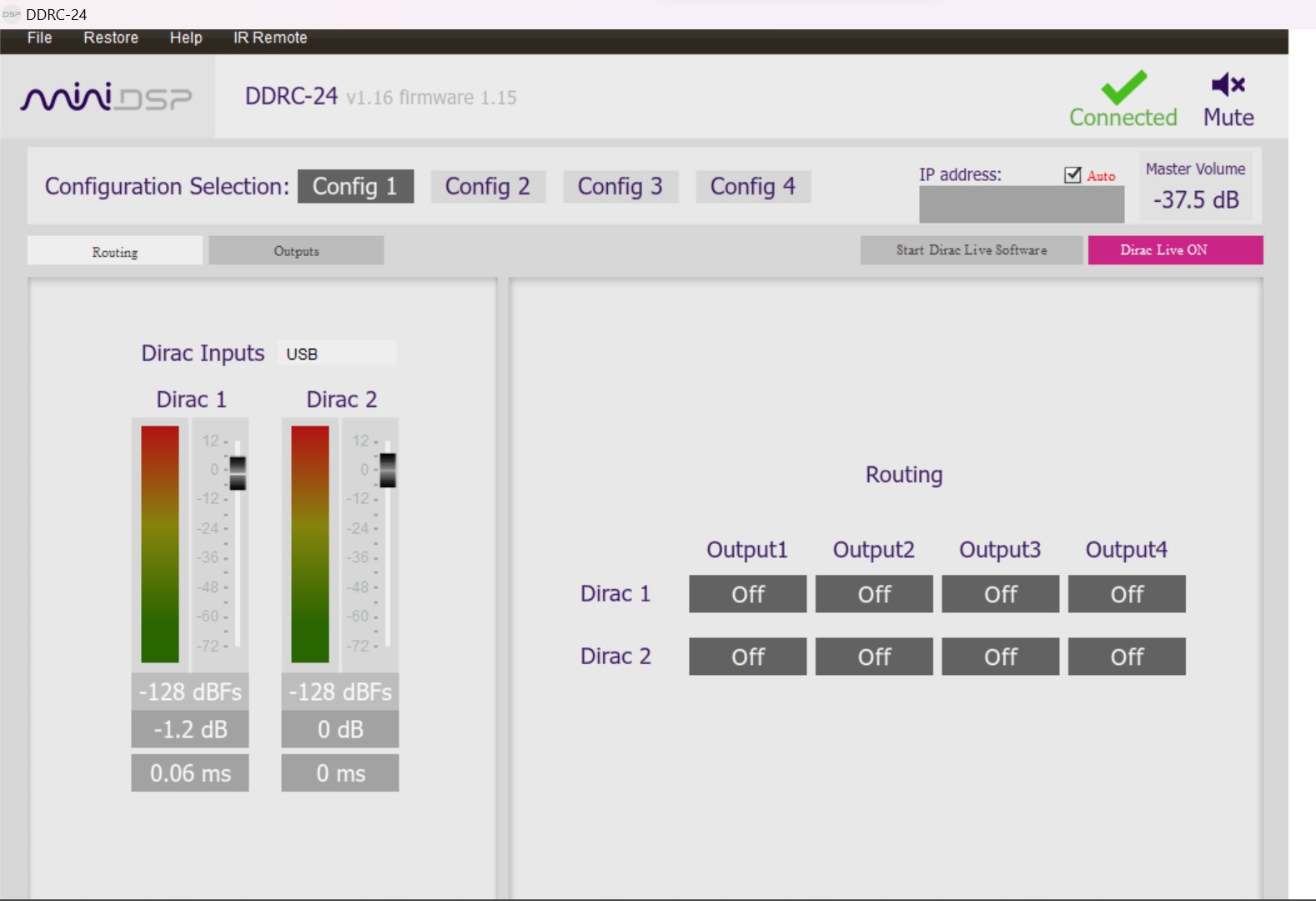 Du musst dirac 1 Output 1 auf on ändern. Ebenso dirac 2 Output 2 auf on. Dann noch den Eingang von usb auf analog.