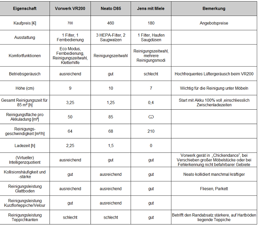 Bei diesen Raumgegebenheiten stellen sich die Unterschiede des Neato D85 zum Vorwerk VR200 bzw. meinem Miele dann wie folgt dar (Merkmale, die ich nicht mit Parametern unterscheiden kann, habe ich mit "gut", ausreichend" oder "schlecht" bewertet):