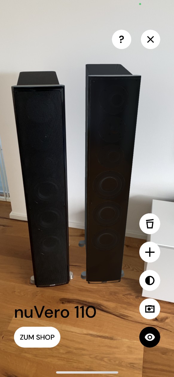 OK, nuRealtiy läuft bei mir (iPhone X). Irgendwie schwebt bei mir aber die rechte Box immer leicht über dem Boden. Die Bedienung der App finde ich etwas hakelig: Mit einer Hand das Smartphone halten, ohne die Kamera abzudecken, mit der anderen die Boxen per Wischgesten drehen und positionieren – anspruchsvoll (zumindest für mich).
