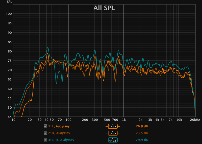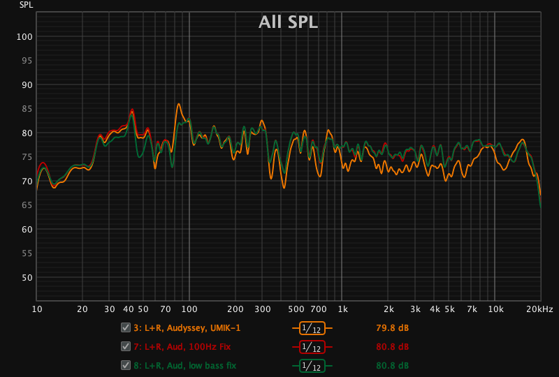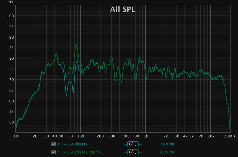 Bei den Messungen finde ich es auch spannend, dass bei aktivem Audyssey der Bass-Bereich ganz gut linearisiert wird, wenn man L und R jeweils separat betrachtet. Zusammen gespielt allerdings kommt der bekannte Dip - den habe ich dann versucht manuell über die Audyssey App auszugleichen, indem ich den Bereich angehoben hab. Das Ergebnis sieht erstmal in der Messung ganz ok aus (bis auf den Anstieg um die 100Hz), würde aber gleich noch Probehören.