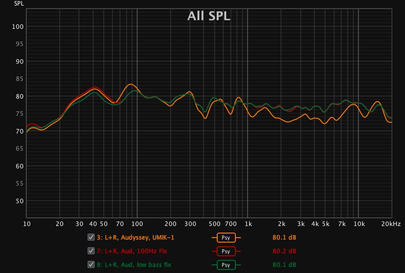 Die orangene Kurve ist die, die ich mir mit den Messungen vor dem UMIK-1 erarbeitet habe - Ausyssey wurde hier auf bis zu 350Hz beschränkt.