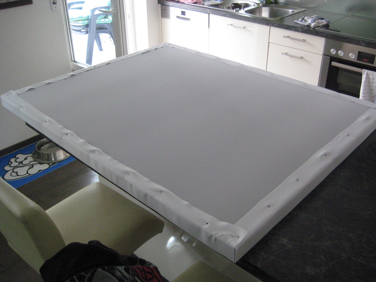 Mittlerweile habe ich auf die Stoffränder noch Tesa-Krepp geklebt, das verhindert, dass bei stärkerer Spannung der Stoff nachgibt.