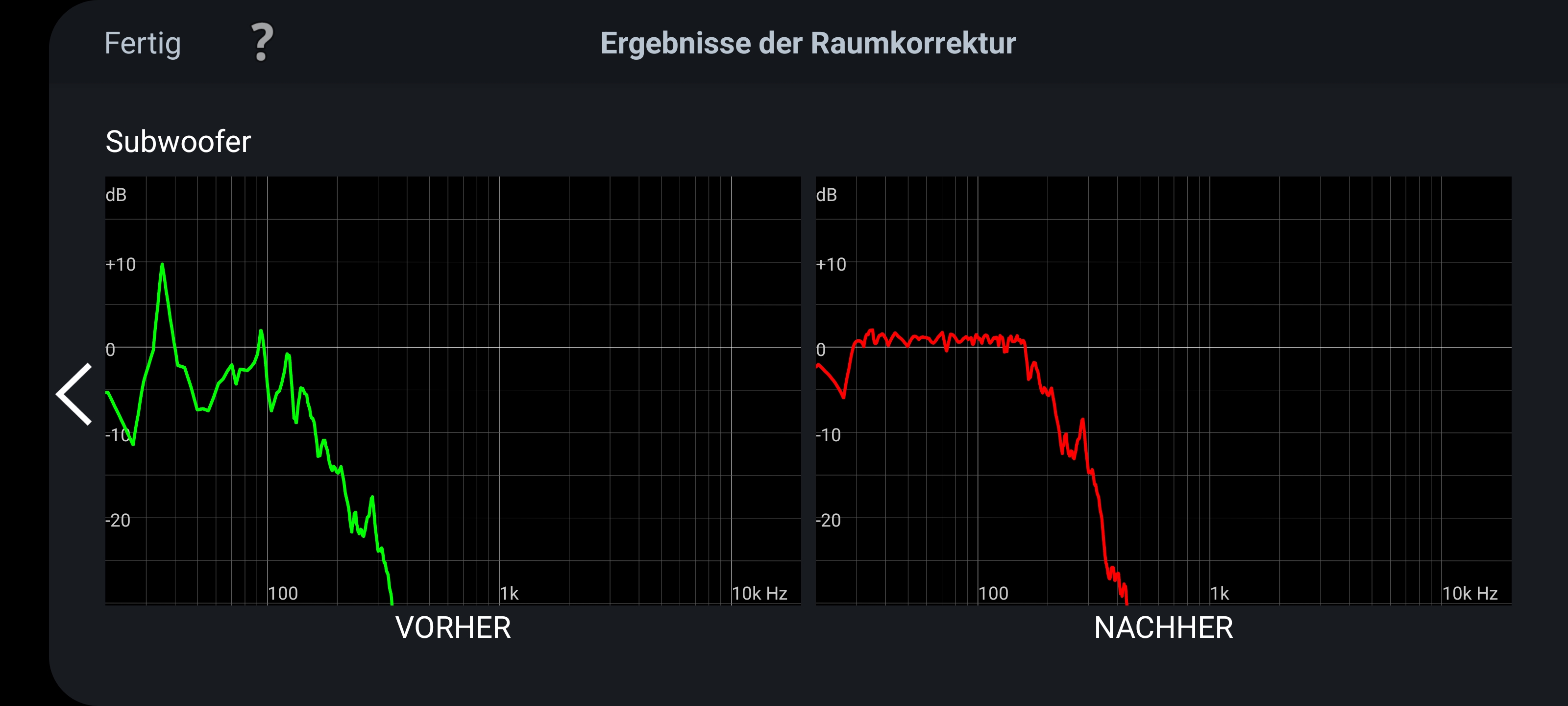 Zu deinen Basspegeln, du hast halt momentan quasi 20db Unterschied im Bassbereich (unkorrigiert), also sehr unausgewogen von +10db bis -10db.