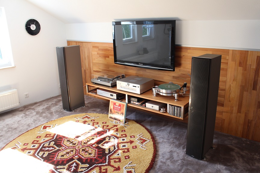 Ich habe euch ja versprochen zu berichten, aber bevor wir auf den Höreindruck eingehen, hier ein paar Informationen zur Aufstellung. Eigentlich wollte ich ja meinen guten alten Sansui mit integrieren. Aber nach der ersten Hörprobe fiel die Entscheidung leicht, den Sansui staubdicht zu verpacken und in den vorläufigen Ruhestand zu schicken. Außerdem war mir das alles zu viel im Board, sah irgendwie unaufgeräumt aus. Aber, seht selbst.