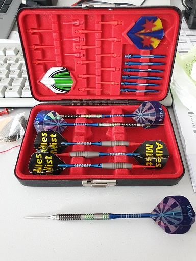 Dann oute ich mich mal. Habe nach der Wende einige Jahre also Ersatzspieler unserer Kietz-Kneipenmanschaft mitgemacht einschließlich Trainingsabende. Sprich nicht absolut schlecht aber auch nicht besonders herrausragen. Zumal mir da auch die Zeit fehlte um jeden Samstag dabei sein zu können wenn Spiele waren, da ich damals alle zwei Wochen 12 Stunden Schichten hatte. Dann nachdem ich 2001 in den Süden gezogen bin, war Ruhe bis unser Chef Anfang des Jahres eine Steel-Dartscheibe aufhängen ließ. Ergebnis eher grottig, da ich nur sporadisch in der Firma bin wirds auch nicht wirklich besser.