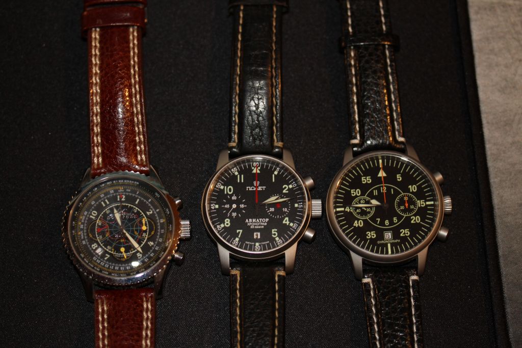 In der Mitte die Poljot Aviator, musste vom Markt genommen werden, weil zu ähnlich mit einer Uhr von Fortis.
