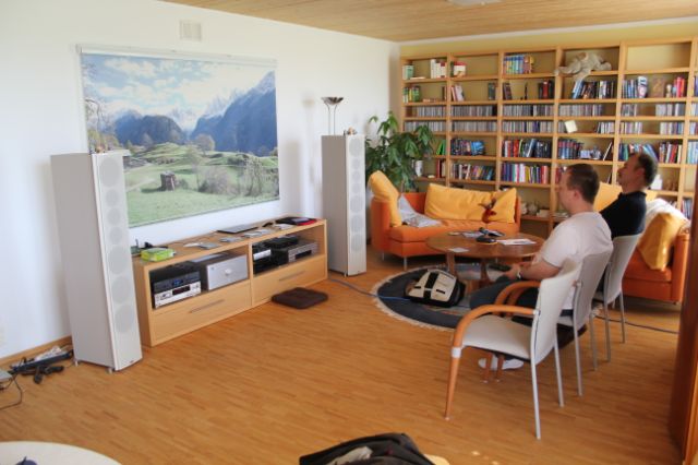 Trotzdem war Christian ja nicht nur zum Quatschen da, sondern primär zum Hören. Mitgebracht hatte er zweimal den Soundtrack von "Herr der Ringe", die einmal in den Cambridge-BluRay und einmal in den Denon-DVD wanderten. Bei geschlossenen Augen schaltete ich am Verstärker hin und her und er meinte, einen kleinen Unterschied zwischen beiden zu hören, der sich aber nur auf den Pegel bezog. Allerdings war uns beiden klar, dass der Unterschied so winzig ist, dass er schon im Bereich der Wahrnehmungsschwelle liegt und vielleicht bei anderer Musik nicht mehr nachzuvollziehen sei. Anschließend wechselte ich noch die Filtereinstellungen am Cambridge, wobei Christian nach dem Hören nur mit den Schultern zuckte. Auch hier hörten wir abwechselnd mit und ohne Sub, wobei wir zu dem Schluss kamen, dass ein Subwoofer nicht nur für Film-, sondern auch für Musikwiedergabe eine hörbare Ergänzung darstellt.