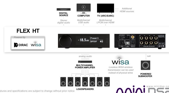 miniDSP Flex HT kann Multichannel USB Audio streaming (up to 7.1) und WISA Wireless audio. Es wird aber immer ein externer Decoder benötigt (z.B. PC) der das 7.1 bereitstellt.