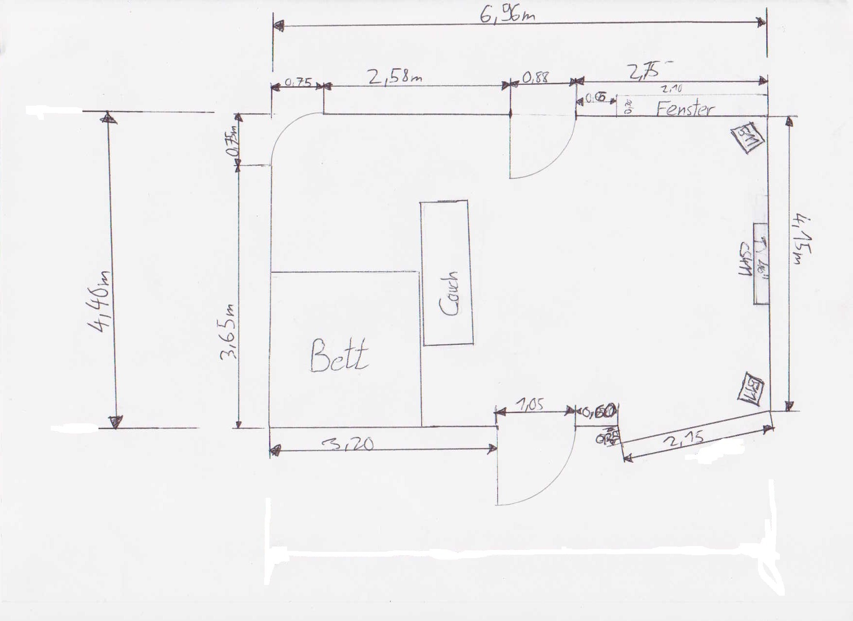 Ich hab grad mal eine kleine Zeichnung per Hand erstellt, damit Ihr euch mein Zimmer mal vorstellen könnt.