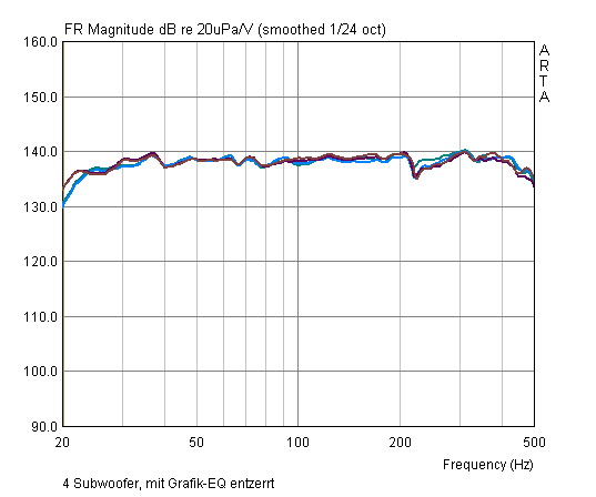 Für diese ersten Schritte reichte eine Entzerrung per grafischem Equalizer. Deswegen sind die Amplitudengänge der Subwoofer etwas wellig: