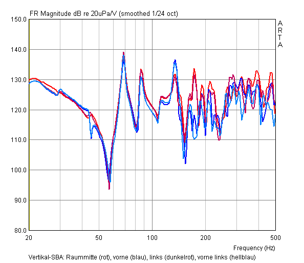Man sieht sehr gut, wie der Schalldruck weitgehend unabhängig von der Position in dieser Ebene ist. In Längsrichtung funktionierte die gestrige Anordnung offensichtlich nicht so gut, zu sehen an dem ortsabhängigen Schlenker bei 45Hz und an der Spitze bei 89Hz, also der nicht ganz eliminierten zweiten Raummode. Die Gründe dafür sind höchstwahrscheinlich eine nicht präzise Aufstellung der Subwoofer und die o.g. Unterschiede in den Stereokanälen sein (vorn und hinten war je ein Kanal). Der kleine Schlenker bei 30Hz kommt von der Zimmertür, die hier mitschwingt, wenn sie zu ist (bei der ersten Messung (rot) war sie nur angelehnt).