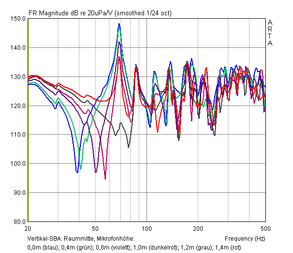 Hier sieht man sehr gut die Auswirkungen von der Reflexion an der Decke. Man sieht die sehr schön ausgeprägte Raummode erster Ordnung bei 70Hz. Ebenso sehr auffällig ist die höhenabhängige destruktive Interferenz. Diese Auslöschung wandert zu hohen Frequenzen, wenn der Reflexionsweg verkleinert wird, also das Mikro nach oben geht. Diese beiden Phänomene sind die beiden großen Nachteile eines SBA. Man kann sie minimieren, indem man die Schallentstehungsorte am besten auf halbe Raumhöhe anhebt. So könnte ein raummodenfreier/auslöschungsfreier Bass bis fast 70Hz möglich sein. Das wird hier aber noch untersucht.