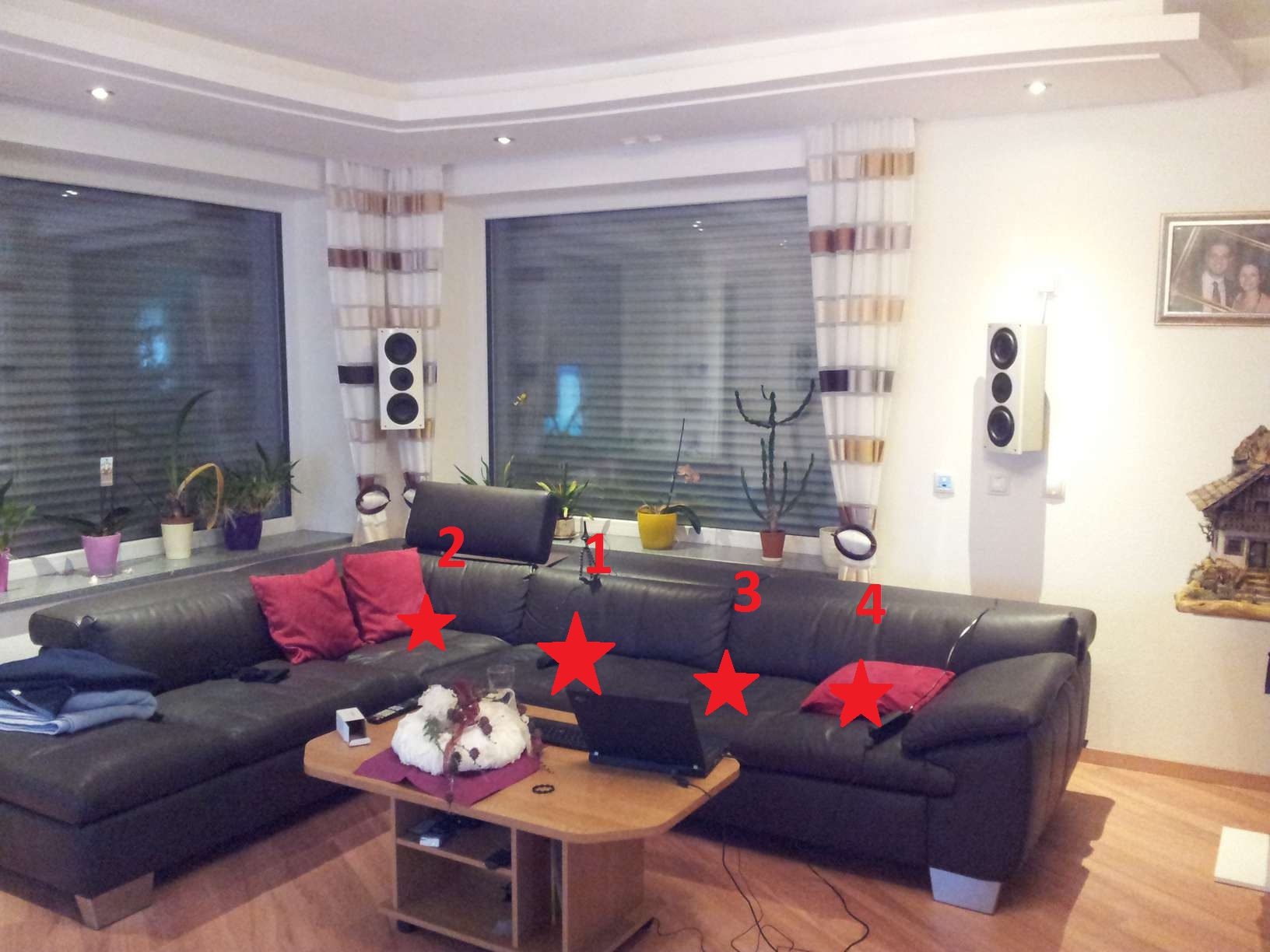 Grundsätzlich zur Aufstellung: "Subwoofer großartig herumstellen" spielts nur an der Wand entlang. Viel mehr weiter nach Vorne darf er nicht. Das Wohnzimmer ist 5,1m "tief", derzeit steht das Chassis des Sub' 55cm vor der Wand entfernt, also ~50cm zu weit vorne, wenn man vom idealen Fünftel ausgeht.