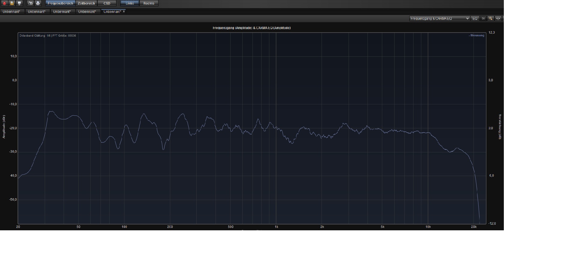 Ich bin mit dem Klang auch soweit zufrieden, habe aber aus reinem Interesse mal einige Carmamessungen vorgenommen. Und da stellt sich ein ähnliches Bild dar, wie schon ohne ATM. Gerade der linke Lautsprecher hat quasi ab 65 Hz eine lineare Bassüberhöhung um 3-4 db, der rechte ebenfalls eine Erhöhung um 55-60 Hz, allerdings linear abfallend.