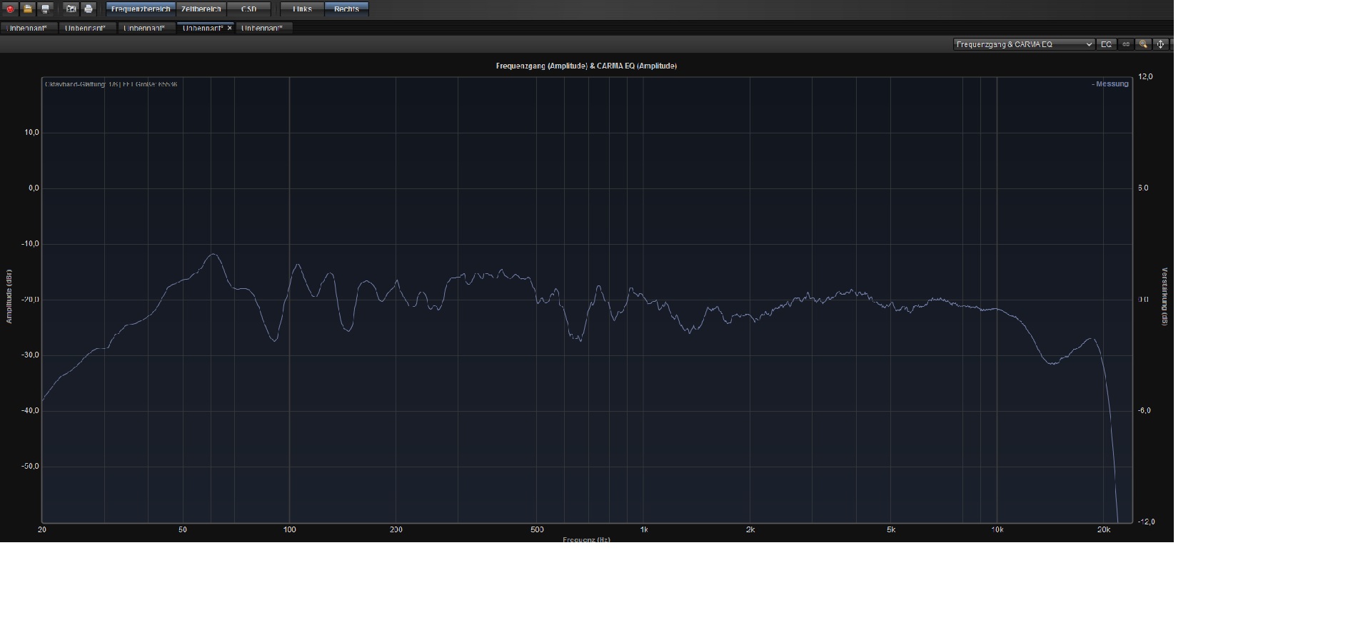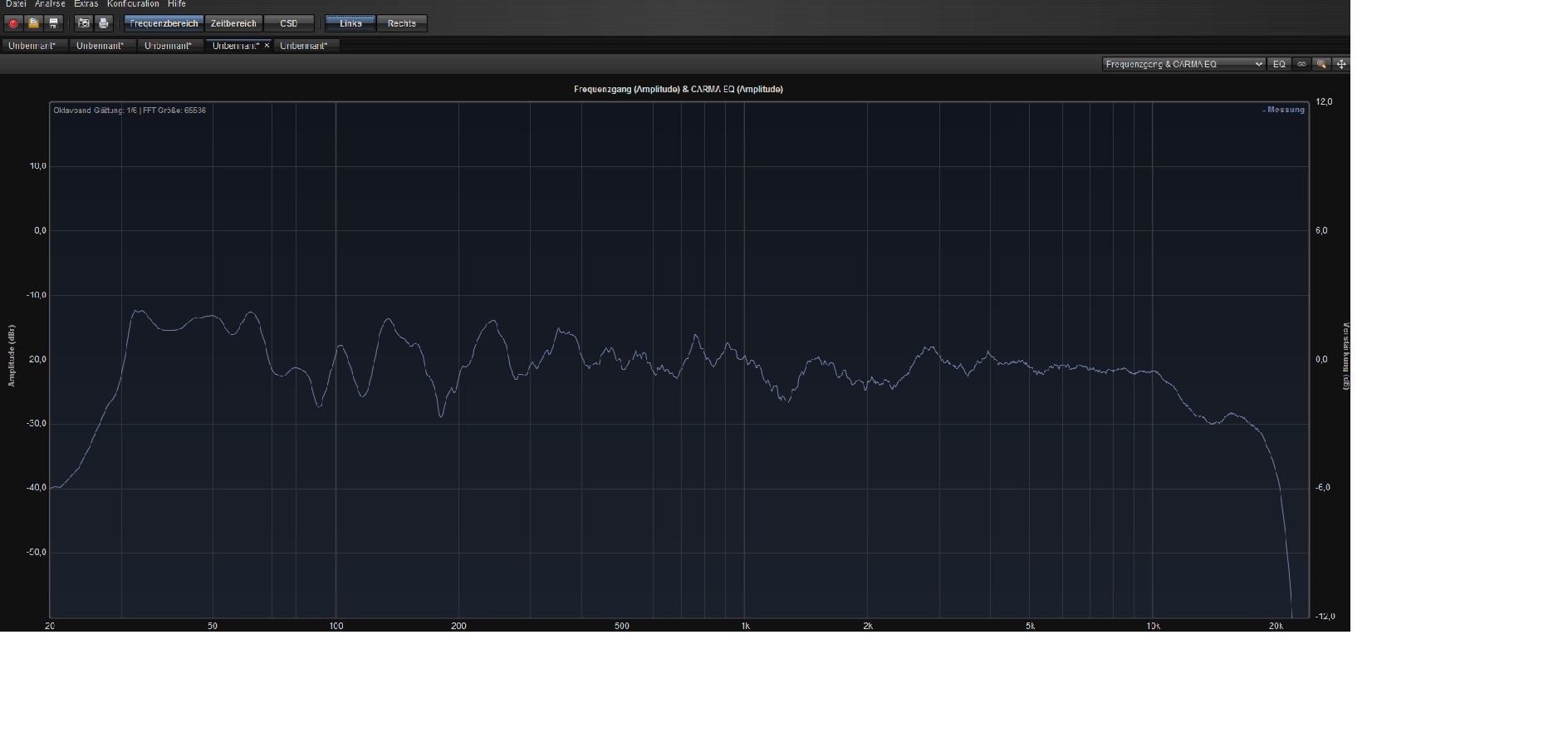 Wird alles wenig Unterschied machen, der Raum bleibt sehr hallig.Ich habe jetzt einfach mal 4 Bilder mit Messungen angefügt, bei denen das ATM im Bassbereich fast deaktiviert war, und der MT/HT leicht angehoben war. Dazu kommt dann noch ein EQ-Eingriff bei besagten 63 Hz um -5 dB.