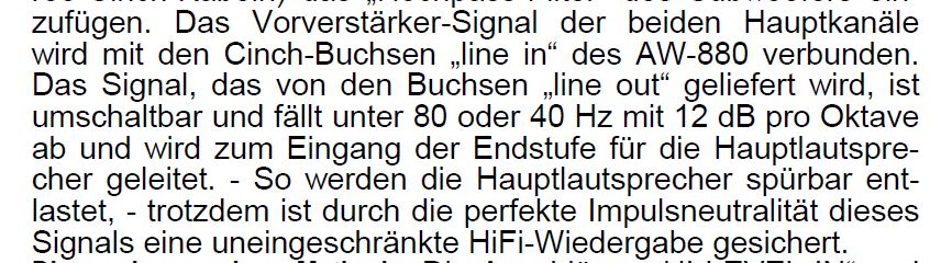 Ich habe einen AW 880 SE der ist mit einem Y-Kabel am AVR Sub-Ausgang angeschlossen. Habe keinen zweiten Sub-Ausgang am AVR.