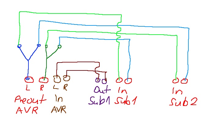 Der AVR will vom ersten Sub ja wieder ein Stereosignal bekomen. So müsste es meiner Meinung laufen: