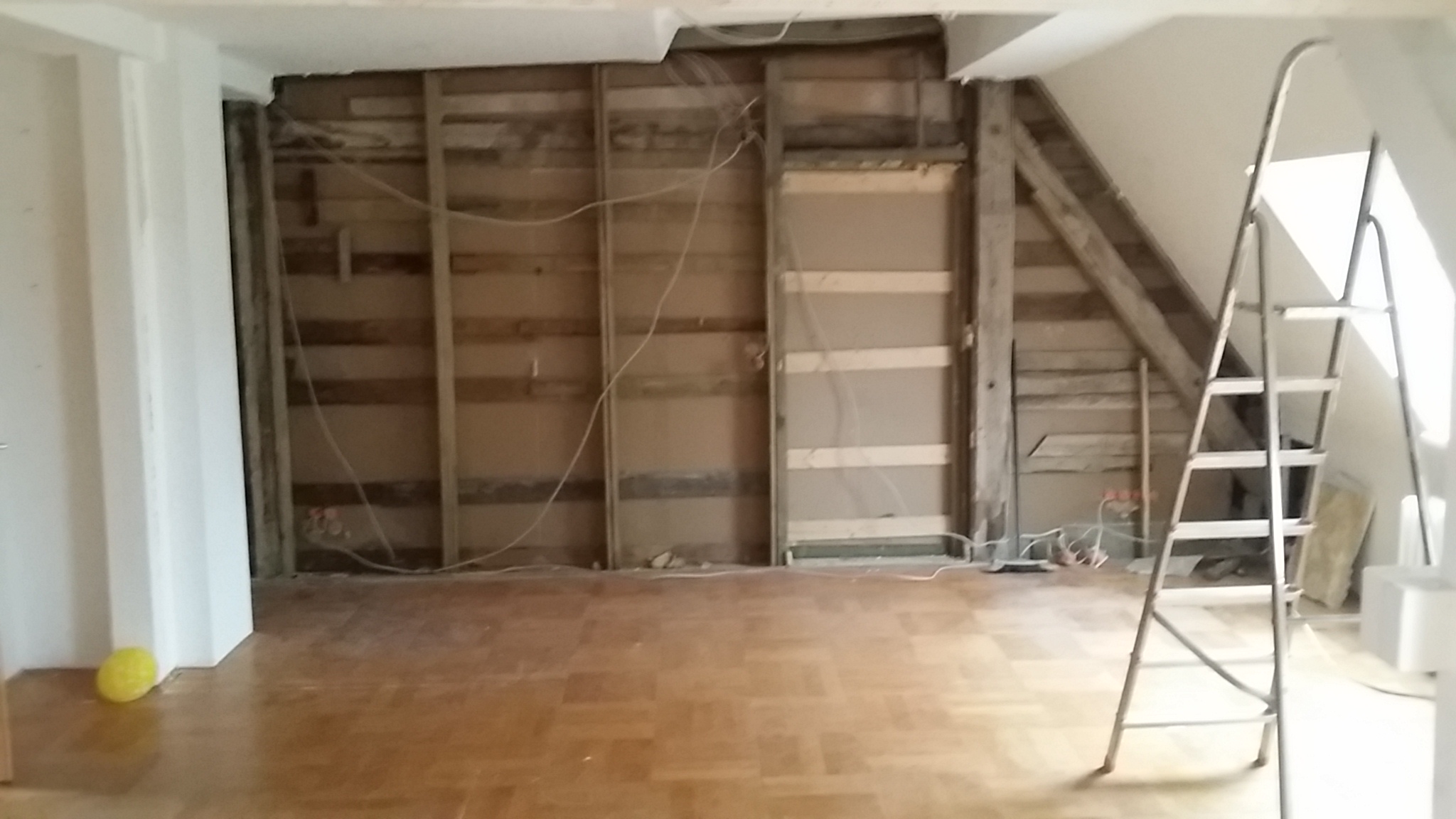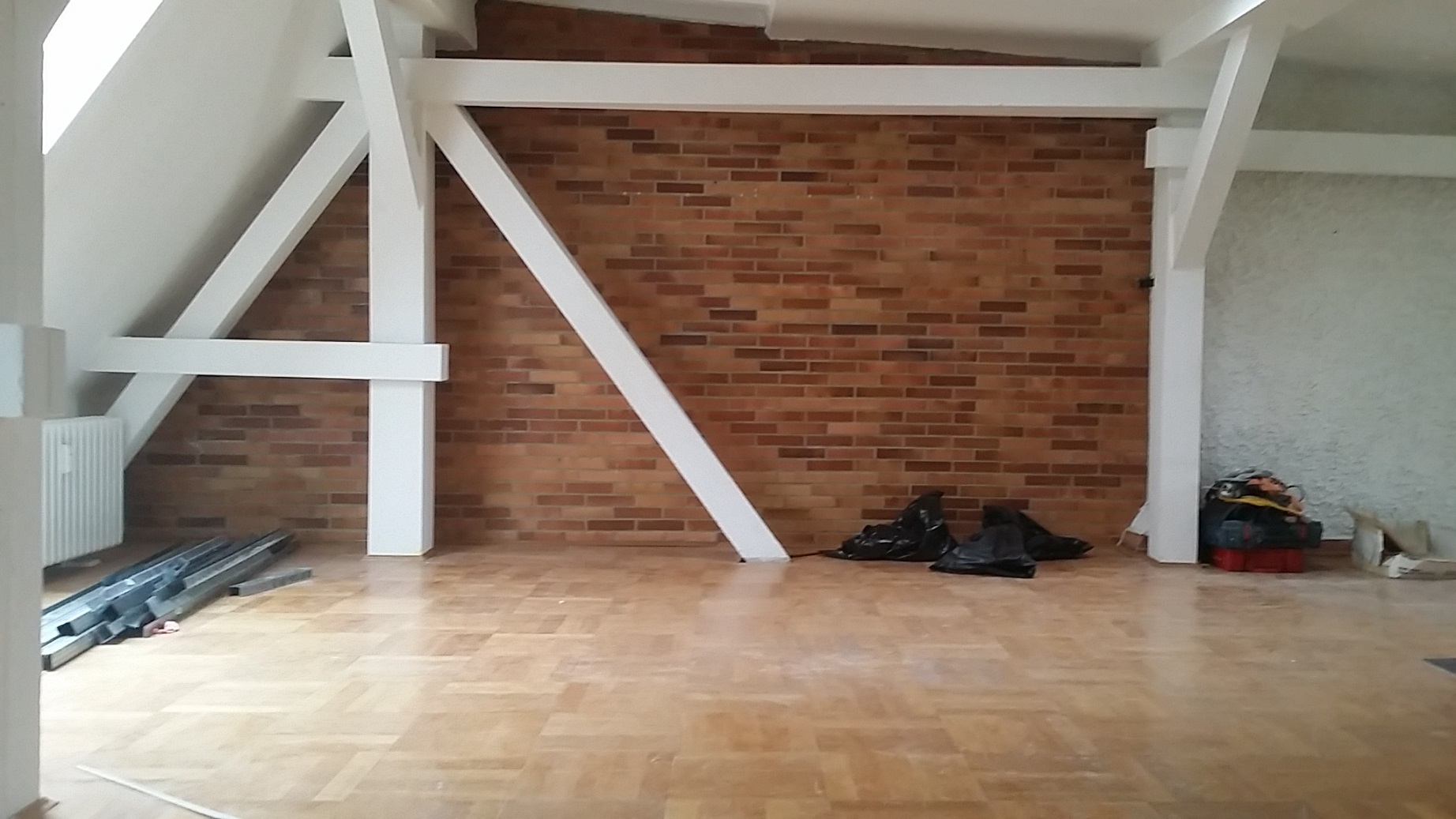 Der Raum ist ca.13m lang und 5-6m breit (sobald die Wand entfernt worden ist(siehe Bilder))