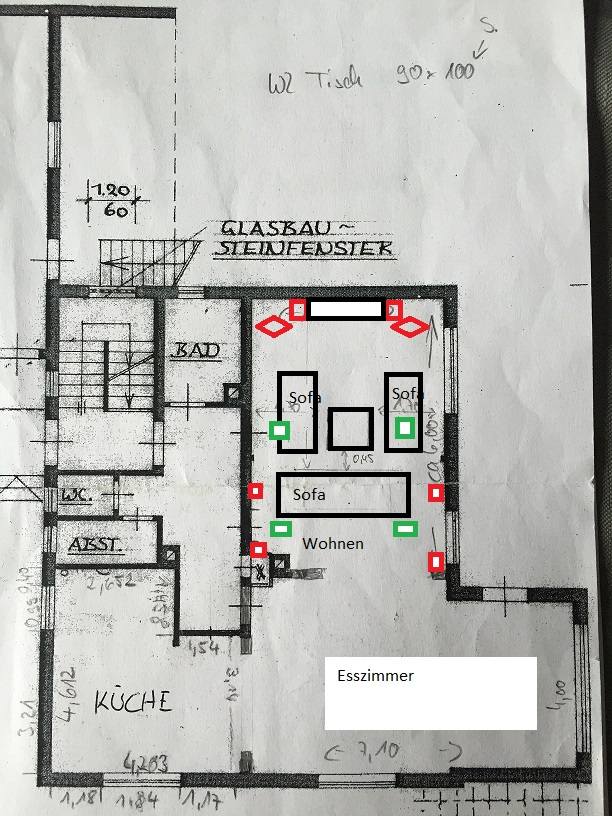 Wie zu sehen ist ist alles sehr offen und daher ist das mit dem Sub so ne Sache. Da WZ hat 4,50x6,00m ca und das Esszimmer nochmal selber 7,10x4,00m