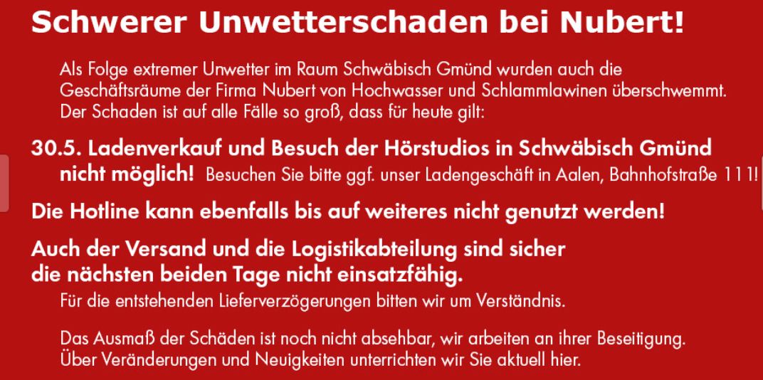 Von meiner Seite hier noch mal die Bestätigung, dass der Betrieb derzeit stark eingeschränkt ist. Wir versuchen, die telefonische und E-Mail-Beratung aufrechtzuerhalten. Bestellungen und Reklamationen können derzeit nicht bearbeitet werden. Ein Versand ist derzeit nicht möglich, ebenso wenig kann ein Verkauf in Gmünd stattfinden. Wir bitten um Verständnis. Wir bemühen uns derzeit noch um eine Schadensaufnahme, aber die Ausfälle sind nach ersten Eindrücken leider sehr umfangreich.