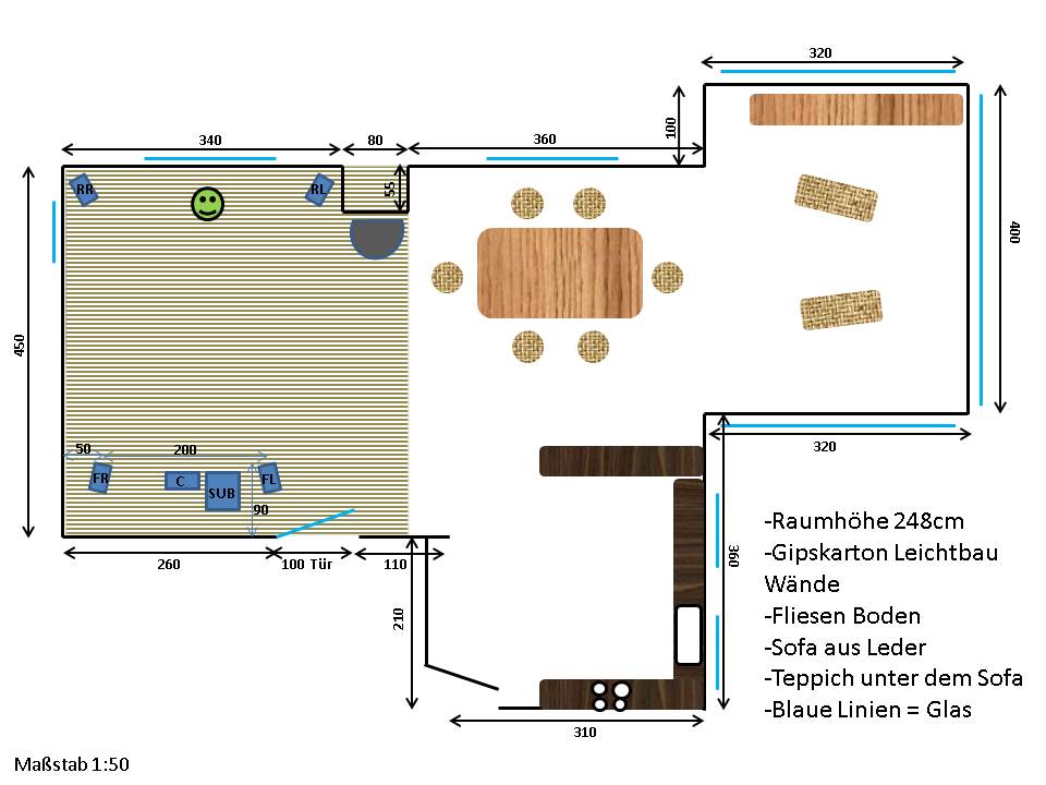 Genau so will ich es letzendlich aufstellen. Macht Akustisch absolut Sinn. Werde ich, wenn es die Zeit zulässt, über die Weihnachtsferien testen. Danke für den Tipp