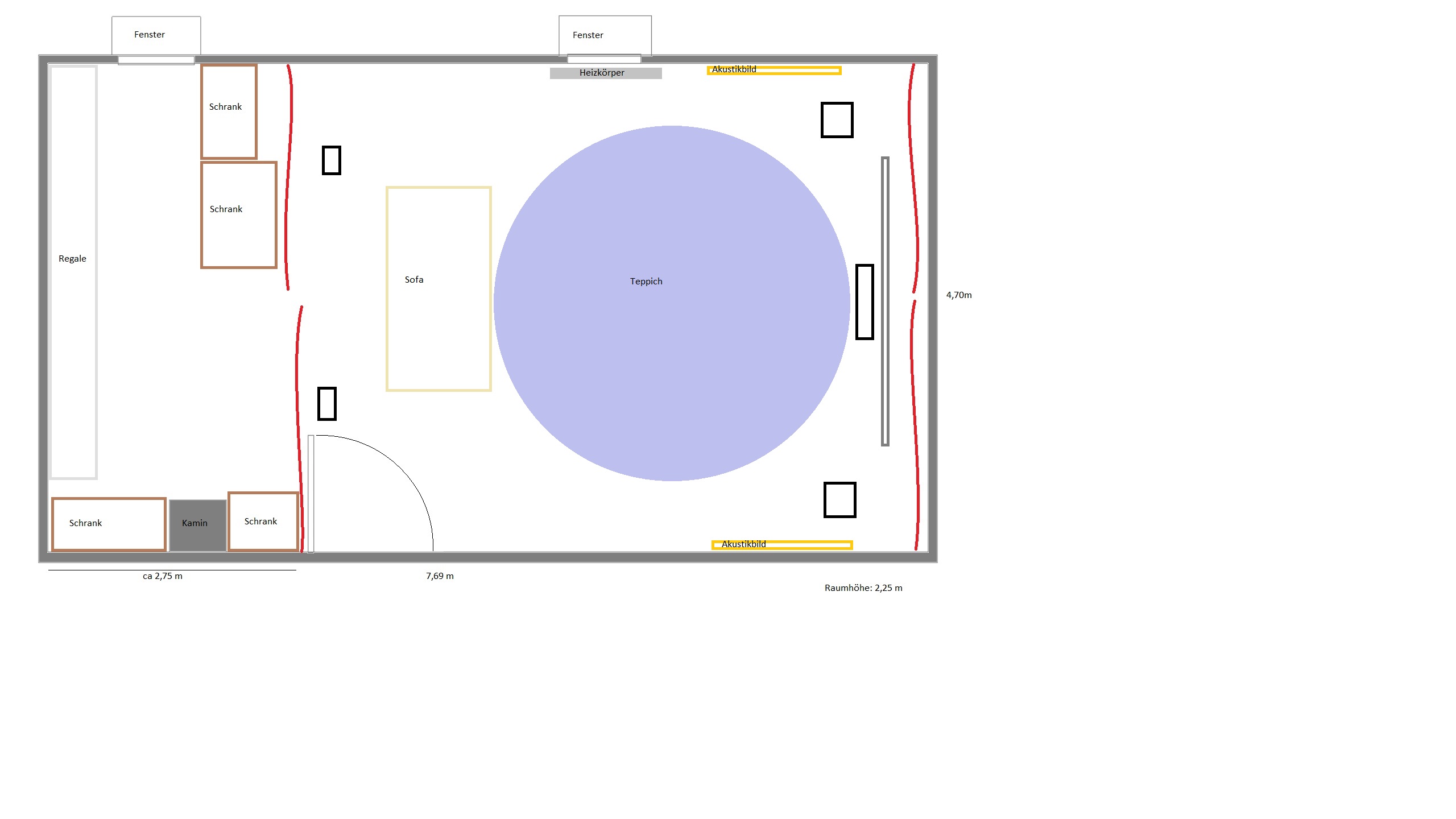 Ausgangslage: Ich habe mir - bevor ich überhaupt über den Boxenkauf nachgedacht habe - sehr viele Gedanken über die Raumaufteilung und die Raumakustik gemacht. Es handelt sich um einen unverputzten Kellerraum. Wie man auf meiner Skizze des Raumes rot eingezeichnet sehen kann, ist dieser mit einem großen, schweren Vorhang getrennt. An der gegenüberliegenden habe ich identische Vorhänge angebracht. Der kleine hintere Teil des Raums dient zu Lagerzwecken (und zur Verbesserung der Akustik :twisted: ). Außerdem habe ich zwei große Rahmen für Akustikbilder gebastelt, die ich demnächst fertigstellen werde. Diese sollen den "First Reflection Points" an den Seitenwänden entgegenwirken. Der Bau von Schallabsorbern an der Decke ist geplant.