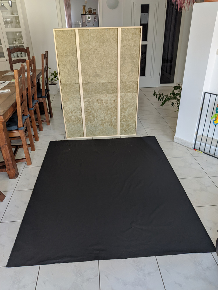 Von diesen Ergebnissen bestätigt und motiviert, waren nun die Wandabsorber an der Reihe. Einen nach dem Anderen baute ich vier quadratische Rahmen (zwei mal 1,40m x 1m x 0,14m und zwei mal 1,20m x 1m x 0,14m), befüllte diese mit Steinwolle (Thermarock 40) und verkleidete sie mit Stoff (Batist, schwarz).