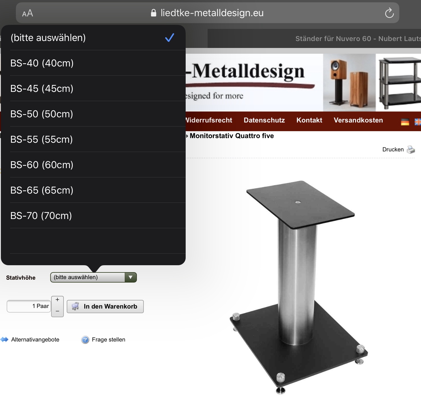 2. Bestellen von Ständern in passender Höhe mit Platte für die Nuvero 60 zum verschrauben bei Liedtke Metalldesign
