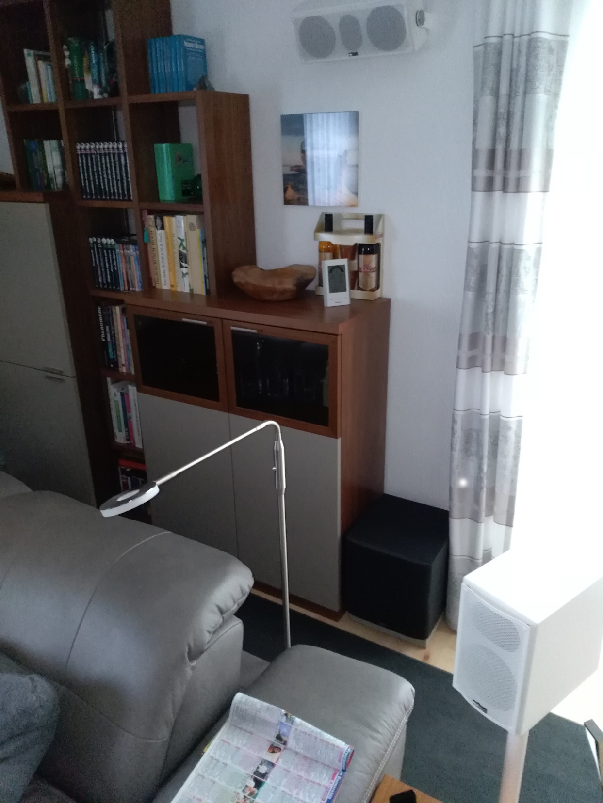 Seit ca. 02/19 sind wir nun im Besitz unten stehender Konfiguration und super zufrieden. Aber der B&W passt nicht mehr so richtig ins Bild. Er unterstützt im Bassbereich ausreichend, obwohl er an der hinteren Wand hinter der Couch (ca. 1 m Abstand von Couch zu Wandschrank) steht und dank Einmesssystem des Marantz klingt es wirklich gut.