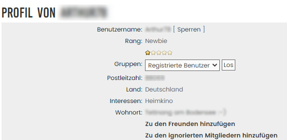 Man kann andere Mitglieder zu Freunden erklären oder ignorieren. Beide Funktionen finden sich auf der Profilseite eines Mitglieds, die man über einen Klick auf der Benutzernamen erreicht. Im Prinzip ist die Freundesfunktion nur ein „Lesezeichen“ für einen bestimmten User und hat ansonsten keinen großen Nutzen. Die Funktion Ignorieren hat etwas größere Auswirkungen – denn Beiträge von so missbilligten Mitgliedern werden in der Thread-Ansicht nicht mehr vollständig dargestellt (PNs von diesen Usern aber weiterhin zugestellt). Man sollte sich sehr gut überlegen, ob man diese Funktion tatsächlich nutzen möchte. Beide Listen werden in den persönlichen Einstellungen verwaltet.