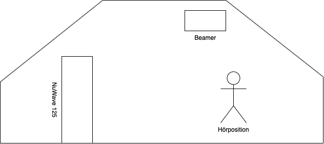 Hier eine sehr grobe Skizze in der Seitenansicht (der Hörplatz - mit einem Sofa ausgestattet - ist etwa 3,10m vom Speaker entfernt):