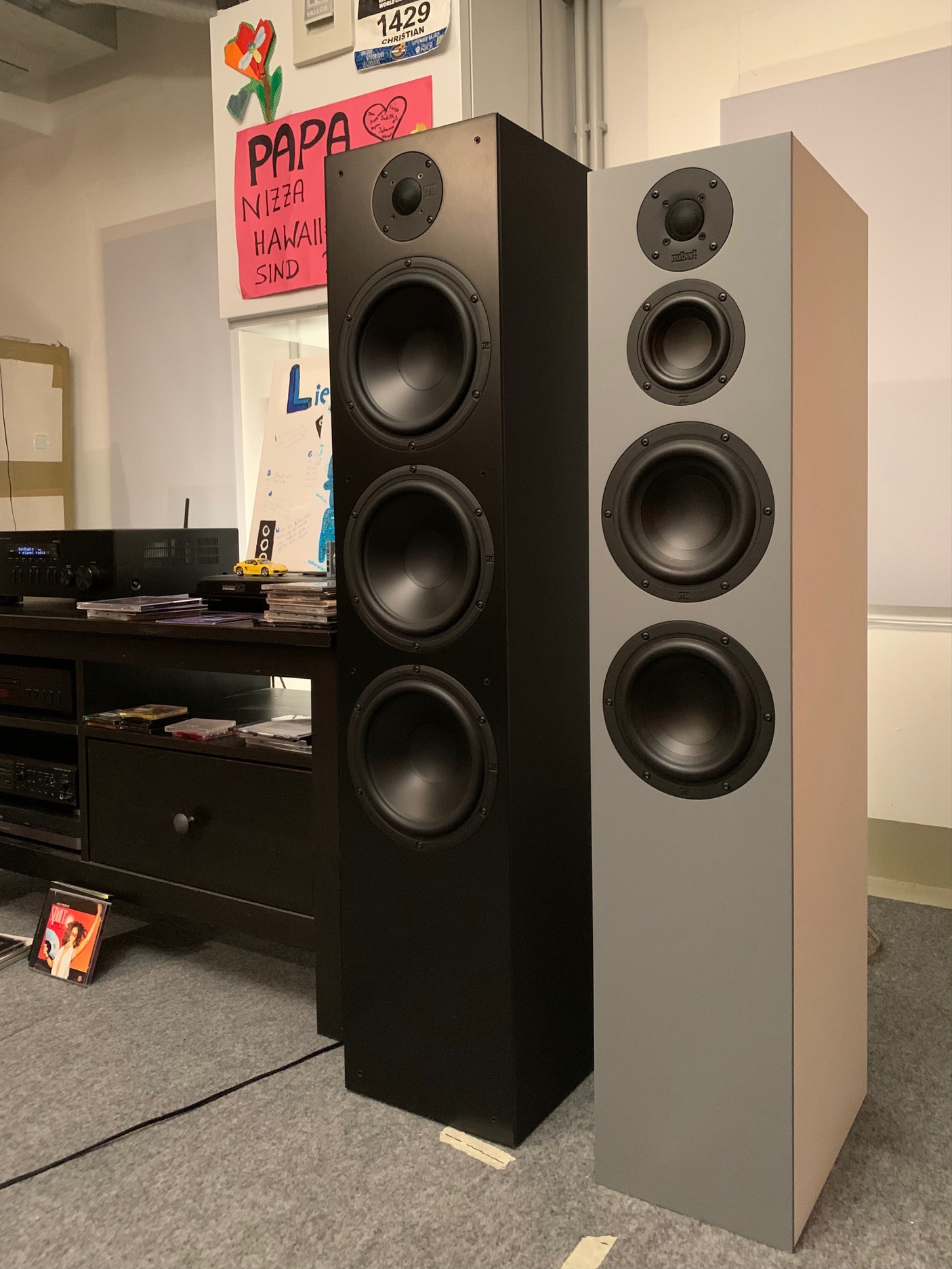 Was mir bei der neuen Serie zunächst auffiel: die Höhen sind recht kräftig. Aber das passt, wenn man beachtet, dass die nuBoxx Modelle nicht stark eingewinkelt werden sollten. Herr Bien empfahl eine wandparallele Aufstellung, die Bedienungsanleitung wird dementsprechend noch entsprechend angepasst. So aufgestellt mit ca. 2,5m Hörabstand, 2m Basisbreite und 1,1m Abstand der Front zur Rückwand ergibt sich ein schöner, harmonischer Klang.