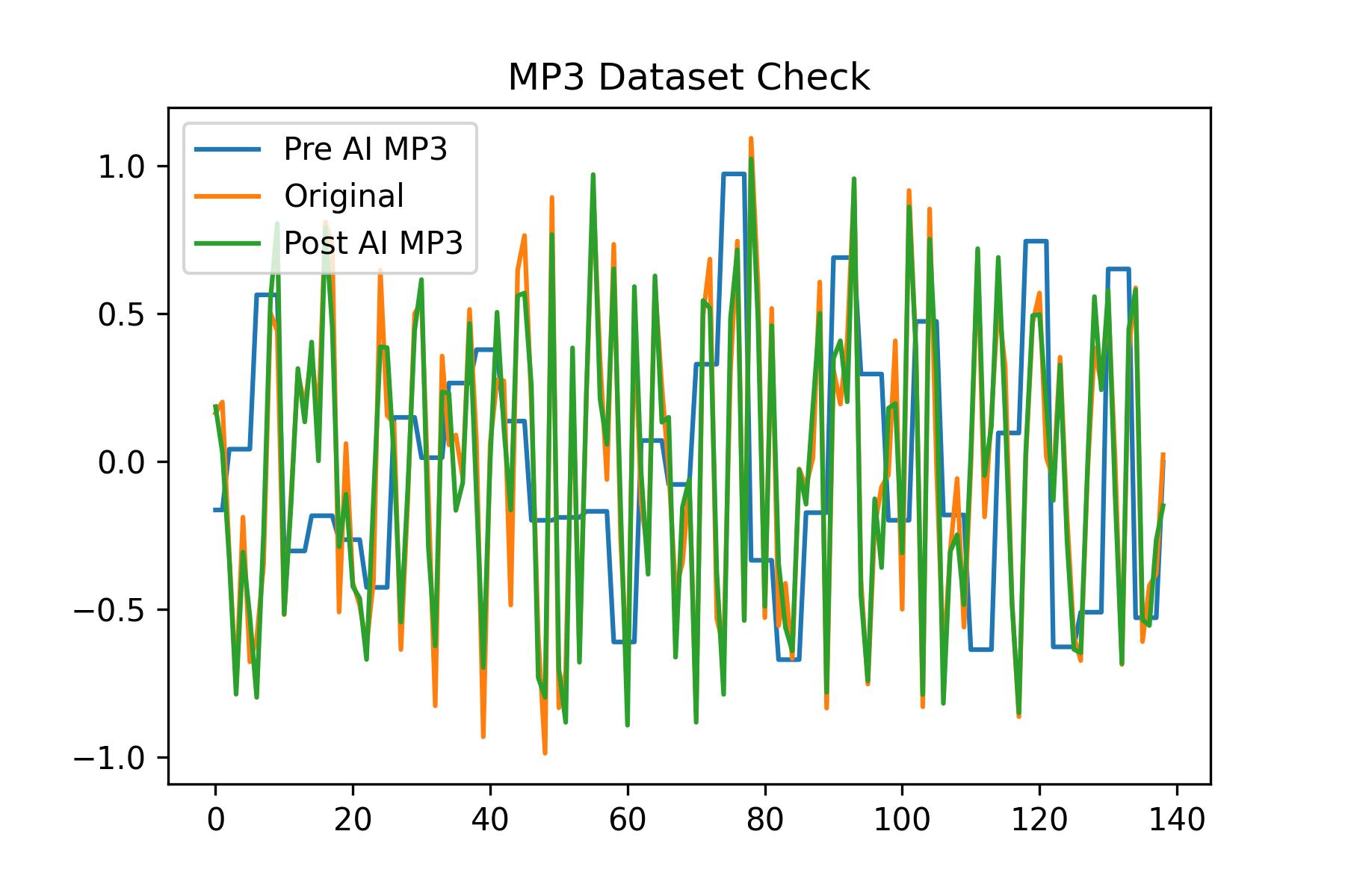 Ein Problem ist auch, dass Audio fortlaufende Daten sind. Das CNN, was ich angewendet habe, ist eigentlich auf separate Datenblöcke wie Bilder ausgelegt. Dadurch entsteht das Problem, dass jedes Stück Audiodaten, was verarbeitet wird, nicht mehr "weiß", wo es wieder beim nächsten Stück ansetzen muss. Das führt unweigerlich zu knacken und ploppen, da die Datenlinie immer einen Knick hat. Ich versuche das demnächst zu lösen, indem ich diesen Knick mathematisch Glattbügele, aber es ist relativ fummelig zu implementieren.